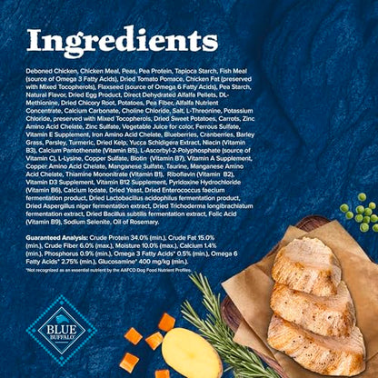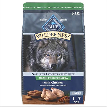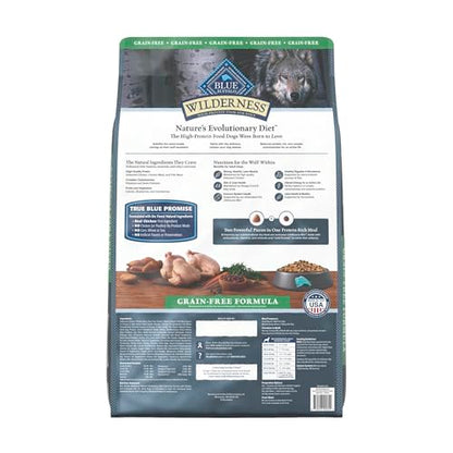 Like their ancestors before them, dogs were born to love meat. That’s why BLUE Wilderness HIGH-PROTEIN DOG FOOD is packed with the meat dogs crave. With delicious real chicken as the first ingredient, Blue Buffalo Wilderness Natural Grain-Free Dry Food for Adult Dogs, Chicken Recipe provides natural, balanced nutrition to help your dog thrive while satisfying their wild side. This protein-rich, grain-free formula contains fats, complex carbohydrates, fruits, and vegetables for wholesome, well-rounded nutrition without the grains some Pet Parents choose to avoid. High-quality protein from deboned chicken helps your dog maintain strong, healthy, lean muscles. BLUE Wilderness dog foods are backed by the True BLUE Promise and always start with real, high-quality meat, poultry, or fish. They contain no chicken or poultry by-product meals, no corn, wheat, or soy, and no artificial flavors or preservatives. BLUE Wilderness is brought to you by Blue Buffalo, the leader in natural pet food. Love them like family. Feed them like family.