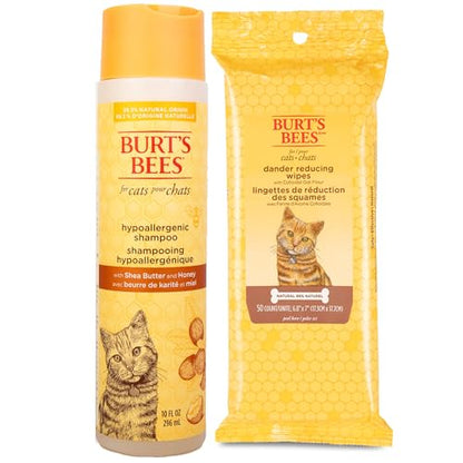- THE PERFECT SET FOR CAT LOVERS — This set of Burt's Bees for Cat Dander Reducing Wipes and Hypoallergenic Shampoo is the perfect duo for cleansing and eliminating dander in your cat's coat. This kit will leave your cat fresh and clean