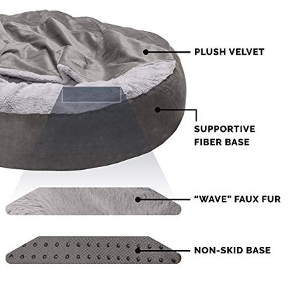 Privacy just got a lot more luxurious with the Furhaven Plush Velvet Waves Donut Dog Beds w/ Blanket. Incredibly soft "waves" faux fur and plush velvet fabrics cradle your pet in a cozy cocoon of comfort and rest. High-loft fiber fill creates a warm, insulating den with deep crevices for snuggling in and nesting. Soft hood provides a blanket of privacy to help pets feel more secure, soothed and safe. Machine washable. Please see seam label or tag for full care instructions.