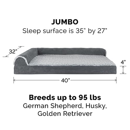 The Furhaven Orthopedic Dog Bed provides large dogs with a supportive place to rest. Styled as an L-shaped chaise, it combines plush comfort with practical details for everyday indoor relaxation. The orthopedic foam base uses an egg-crate design to cushion pressure points and ease stress on hips and joints, making it ideal for pets at all life stages. Bolsters along two sides create a secure corner that supports the back and hips while doubling as a pillow for the head or paws. The soft faux fur sleep surface feels gentle against noses and paws, while suedine bolsters add a smooth contrast that blends easily with home décor. The two-tone fabric helps hide dirt and pet dander, so the bed looks fresher between washes. For easy care, the cover is fully zippered, removable, and machine washable, while the foam mattress should be spot cleaned only. The bed ships compressed—allow up to 48 hours for the foam to expand fully and gently fluff the bolsters to restore their shape. Designed for dogs up to 95 lbs, this chaise-style bed is a supportive retreat for both nesters and sprawlers.