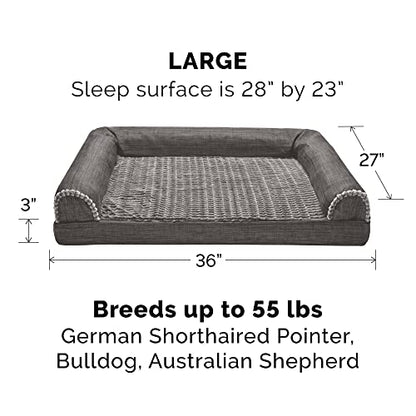 Perfect for pets young and old, the Furhaven Luxe Faux Fur & Performance Linen Sofa-Style Dog Bed is designed to provide your loved one with maximum comfort for a good night’s rest. With a soft, plush embossed sleeping surface your dog will be more snug than a bug in a rug! The orthopedic (egg crate) foam base supports your pets joints and pressure points making this pet bed ideal for arthritic pets who have trouble getting comfortable. The Jumbo Plus option, for larger breeds, features solid slab orthopedic foam for greater support and comfort. Give your companion the luxury they deserve with this orthopedic dog bed. They’ll love the linen bolsters' soft but supportive feel provided on three sides giving them a variety of cozy positions to snuggle into. The bolsters are a great pillow for your pet to lie their head on or, for pets that like to cozy into your couch, they can snuggle close to the sides for a sense of security and warmth. Whatever position your pet likes to lay in, they’ll find nothing but comfort and sweet dreams! With the feel of a couch, your pet will love having their own space to curl into while you’ll love having your favorite spot on the couch back! No more unwanted pet fur and scratches on your furniture. It’s great for older pets who may be unable to jump on the couch and have had to lie on the floor. Easy to clean. Cover care: Remove from core before washing (see seam label for fabric care instructions). Foam care: Spot clean with mild soap; rinse. Blot, then air dry. Do not wring. Not for unsupervised use by animals with chewing behaviors.