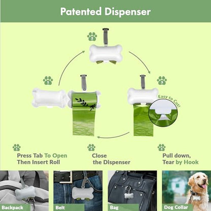- PATENTED DISPENSER INCLUDED: Our One-of-a-Kind, Patented and Practically Designed Dispenser has a Hook Removing 1 Bag from the Roll Automatically. No More Panic after Taking out More than one Bag at a time. The Top of the Dispenser has an Easy-to-Use Strap to Attach it Anywhere. Attach it to your Dog's Harness or Pants for Easy Portability.