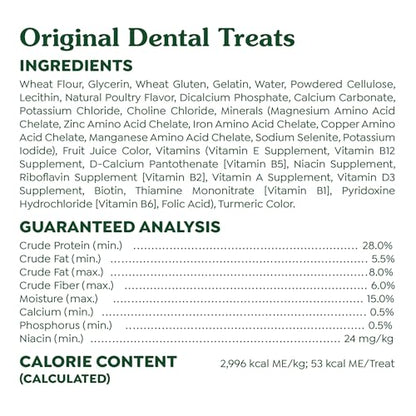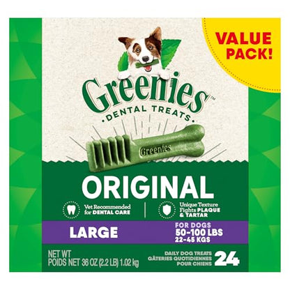 One Greenies Original Dental Treat a day is all it takes for clean teeth, fresh breath, and a happy dog. Large breeds can't wait to sink their teeth into these delicious, original-flavor dental dog breath chews because they feature a delightfully chewy texture that fights plaque and tartar. Irresistibly tasty and incredibly powerful, Greenies Treats for Dogs are vet-recommended for at-home oral health care and accepted by the VOHC (Veterinary Oral Health Council.) Best of all, these natural dog breath treats are made with highly soluble ingredients that are safe and easy to digest. Give your Large dog the mouth-wowing treat that helps promote their overall health with Greenies Dog Treats. Natural Dog Treats Plus Vitamins, Minerals, and Other Nutrients.