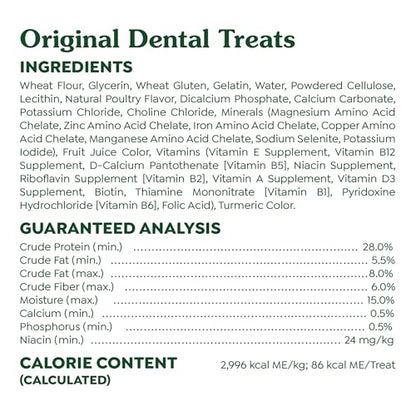 One Greenies Original Dental Treat a day is all it takes for clean teeth, fresh breath, and a happy dog. Your dog can't wait to sink their teeth into these delicious, original-flavor dental dog chews because they feature a delightfully chewy texture that fights plaque and tartar. Irresistibly tasty and incredibly powerful, Greenies Treats for Dogs are vet recommended for at-home dental care. Best of all, these natural dog treats are the perfect breath freshener to help fight bag dog breath and are made with highly soluble ingredients that are safe and easy to digest. Give your canine the mouth-wowing treat that helps promote their oral hygiene and overall health with Greenies Dog Treats. Natural Dog Treats Plus Vitamins, Minerals and Other Nutrients. Amazon.com GREENIES Canine Dental Chews are the number-one vet-recommended dental chew.* GREENIES Canine Dental Chews are proven to clean dogs’ teeth by fighting both plaque and tartar buildup, freshening breath, and maintaining healthier teeth and gums. Designed for daily treating, our dental chews are low in fat and nutritionally complete for adult dogs.