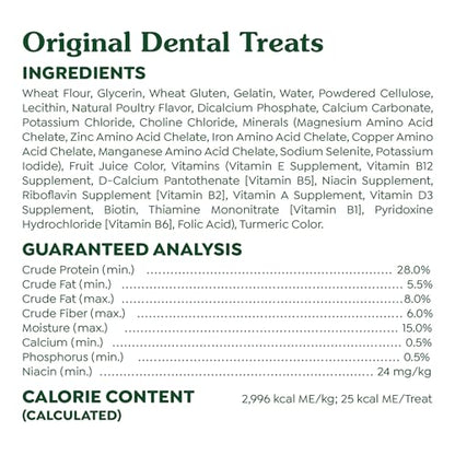One Greenies Original Dental Treat a day is all it takes for clean teeth, fresh breath, and a happy dog. Your dog can't wait to sink their teeth into these delicious, original-flavor dental dog chews because they feature a delightfully chewy texture that fights plaque and tartar. Irresistibly tasty and incredibly powerful, Greenies Treats for Dogs are vet recommended for at-home dental care. Best of all, these natural dog treats are the perfect breath freshener to help fight bag dog breath and are made with highly soluble ingredients that are safe and easy to digest. Give your canine the mouth-wowing treat that helps promote their oral hygiene and overall health with Greenies Dog Treats. Natural Dog Treats Plus Vitamins, Minerals and Other Nutrients.