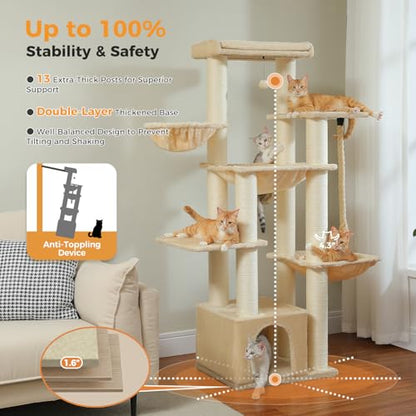New Large Cat Tree 67" Tall Tower with 13 Sisal Posts | Beige, 67"