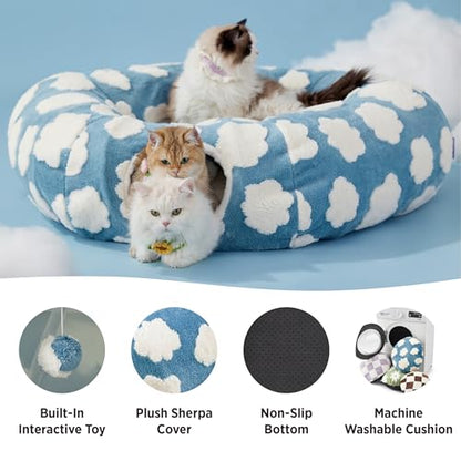 New Lesure Large Cat Tunnel Bed (Peekaboo) | Cozy Clouds Blue & Large