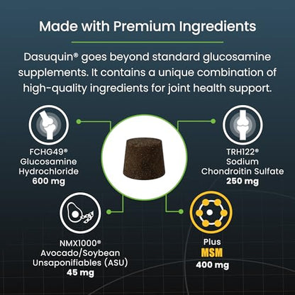 DASUQUIN soft chews with MSM are the exclusive veterinary formulation that contains the potent combination of Glucosamine hydrochloride, low molecular weight chondroitin sulfate and avocado/soybean unsaponifiables (ASU) and methylsulfonylmethane (MSM). Dasuquin with MSM is formulated to deliver maximal cartilage support