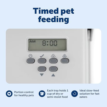 Mealtime is made simple and stress-free with the PetSafe 5 Meal Pet Feeder. Perfect for cats and small to medium-sized dogs, this programmable feeder ensures your pet never misses a meal, whether it’s breakfast, lunch, dinner, or snack time. The digital timer allows you to schedule up to five meals in advance, each served down to the minute, so your pet’s feeding routine stays consistent and reliable. One tray section is available for immediate feeding, while the remaining four rotate automatically at scheduled times. This makes it easy to stick to portion control, prevent overeating, and maintain a healthy daily diet for your pet. Each of the five compartments holds up to one cup of dry or semi-moist food, making it versatile enough for kibble, jerky bites, or freeze-dried treats. The feeder is also a great solution for pets that eat too quickly, allowing you to divide their meals into smaller servings throughout the day. The tray is fully removable and dishwasher safe for quick cleaning, giving you a hygienic and low-maintenance feeding station. Since 1988, PetSafe has been driven by a simple belief: safe, healthy pets lead to happier lives for pets and their families. For over 25 years, we've been dedicated to enhancing the lives of pets and the people who love them, treating every pet as a cherished family member and delivering life-changing innovations designed to enrich every moment. With U.S. roots and a global reach, our vet- and trainer-recommended products are built for every pet and backed by exceptional customer support. From backyards to dog parks, we're on a mission to create fields of joy for happy, healthy, and safe pets.