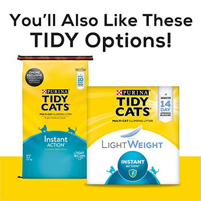 Put an end to overpowering odors in your home with Purina Tidy Cats Instant Action clumping litter for multiple cats. We know you have no time to waste, and that is no problem with this unique formula. This clumping cat litter is designed to trap odors from the start, and the odor-neutralizing power protects against ammonia, urine and feces smells for all-in-one odor control. Put the guaranteed Tidy Lock protection to work and help lock away odors for a clean, fresh-smelling home so that you can feel confident inviting over friends and family. This clump and seal cat litter, formulated for multiple cats, creates an inviting atmosphere for your cats, no matter which litter box they choose. Scoop and move on with your day by filling each litter box in your home with Purina Tidy Cats Instant Action clumping cat litter for multiple cats, and leave the strong odors behind. Show your cats you are just as fond of them as they are of you by ordering Purina Tidy Cats kitty litter at Amazon.com. Ingredient Natural Clay Product with Deodorizing System. Directions Clean the cat box with warm water and a mild detergent between litter changes. Directions: 1. Pour to a depth of 3-4 inches. 2. Remove solids daily. 3. Add more litter to maintain a depth of 3-4 inches. Warnings Note: We want to remind those with suppressed immune systems and pregnant women that a parasite sometimes found in cat feces can cause toxoplasmosis. Please wash hands thoroughly after handling used cat litter. Encouraging your cat to use an indoor litter box, or properly disposing of outdoor cat feces, is beneficial to overall water quality. Please do not flush cat litter in toilets or dispose of it outdoors in gutters or storm drains. Used litter is not recommended for garden use. Product is filled by weight; some settling may occur.