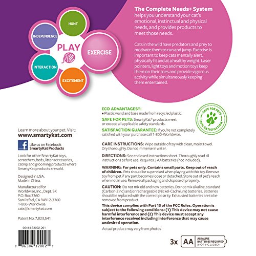 SmartyKat’s Hot Pursuit electronic concealed motion toy mesmerizes cats by replicating the erratic movements of hidden prey. The two interchangeable wands flit and zip, unpredictably changing directions with only a teasing bit visible from under the durable fabric cover. This fascinating movement encourages healthy activity through the fun of play, and the four speed controls allow you to customize the action for your cat. SmartyKat gives pet parents the best of all worlds: innovative products, stylish designs, environmental responsibility, and exceptional value with a variety of toys to meet a cat’s need for play, scratching, wellness, rest, and fun! A member of the Worldwise family of pet products, SmartyKat is grounded in the principles of pet safety, customer satisfaction, and environmental responsibility. SmartyKat products are designed to meet or exceed all applicable safety standards. They are then tested against those standards to ensure they meet our strict quality and safety requirements – ensuring they’re safe for all members of your family.