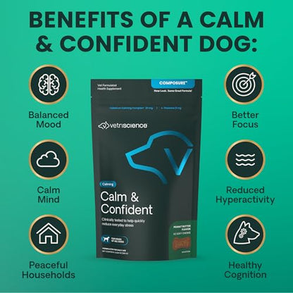 Help remove the stress from your pup's life and transform their anxious behavior with VetriScience Calm & Confident. (New name, same great original Composure formula!) These delicious bite-sized chews are made in the USA and designed to help calm and soothe anxious and stressed-out dogs with naturally sourced ingredients. The colostrum blend not only helps to reduce stress, but it also supports your dog's cognitive function. The VetriScience Calm & Confident formula has been clinically tested and shown to work in just 30 minutes with results lasting up to four hours. Give the recommended number of chews to your dog before their next vet visit, during the next thunderstorm, or whenever they're in a stressful situation - you can even double or triple the dose if needed during periods of added stress. If your dog is showing signs of anxiety like excessive barking, destruction of household items, hiding, or separation anxiety, grab a bag today and see the results for yourself. Once dogs get a taste of the delicious flavor and scrumptious chewy texture, they'll be begging for more! Are you looking for the Golden Years Calm & Confident formula? Check out VetriScience Senior Calm & Confident.