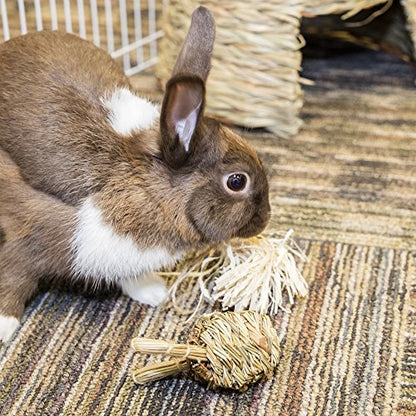 This fun-e-bunny is a naturally flavorful playtime toy for rabbits, guinea pigs, chinchillas, and pet rats. All natural materials are safe to chew and help relieve boredom. Measures 3-inch width by 1-3/4-inch depth by 9-1/2-inch height.