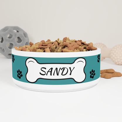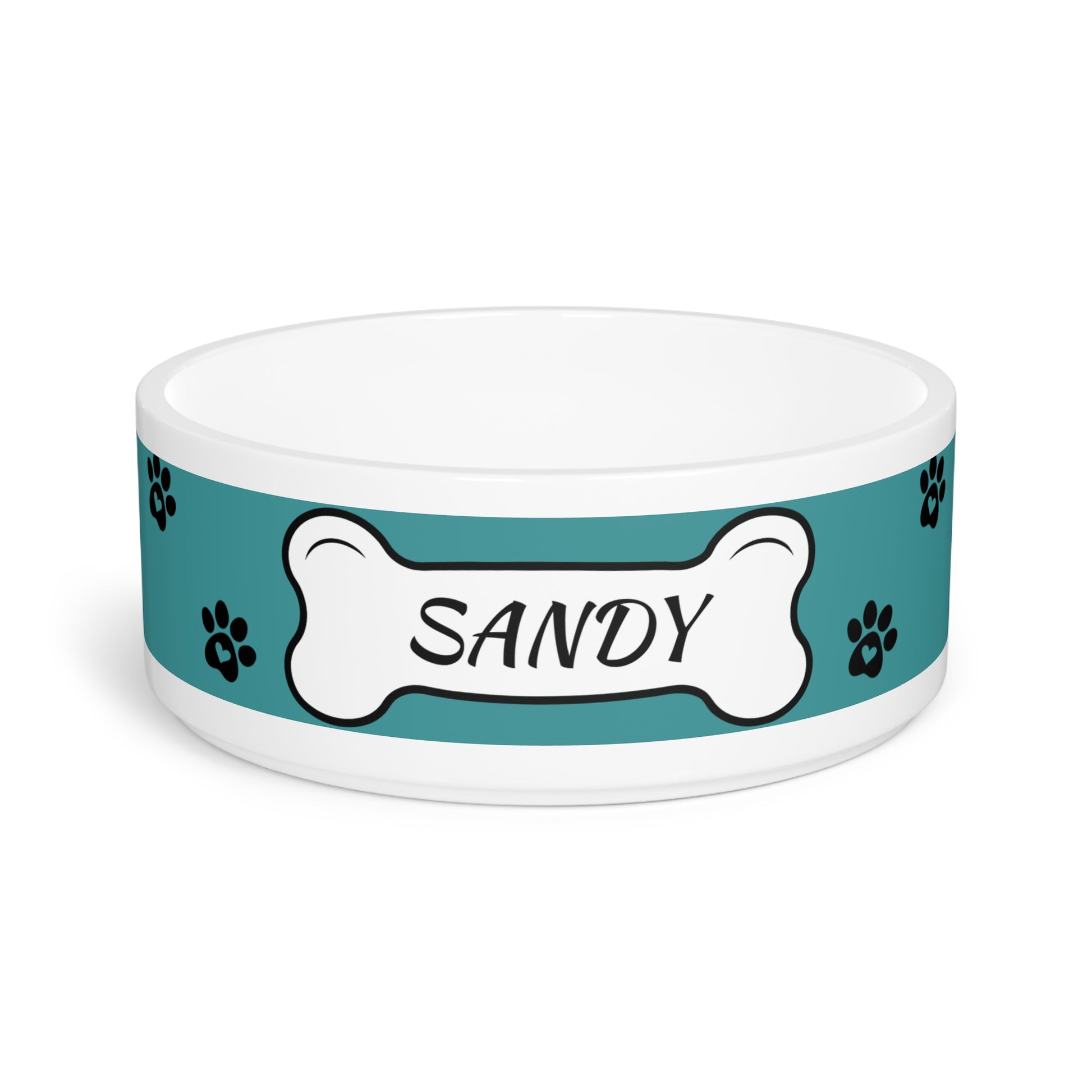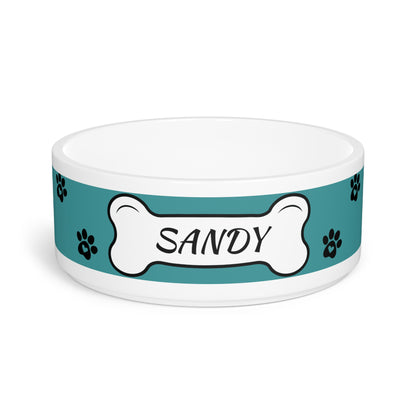 Personalized Pet Bowl — Teal Paw Print Dog Bowl with Bone Nameplate (Custom Name)